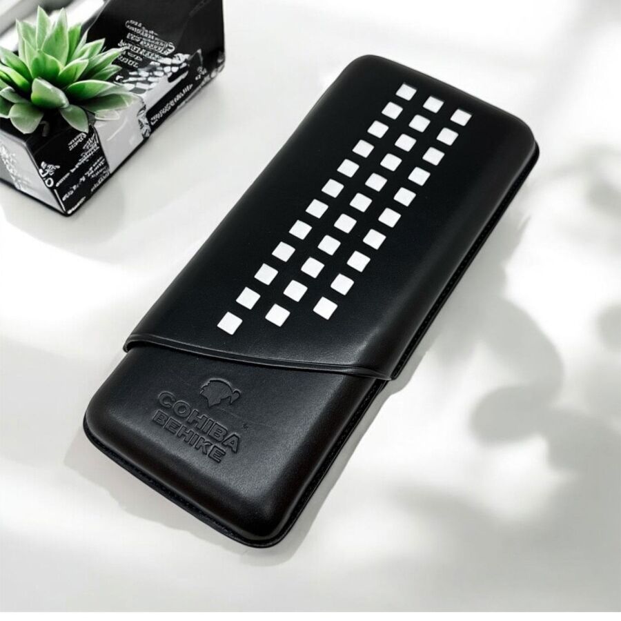 Sofistike siyah beyaz deri tasarımı ile Cohiba Behike Deri Puro Kılıfı, purolarınızı hareket halindeyken korumanız için mükemmel bir aksesuardır.