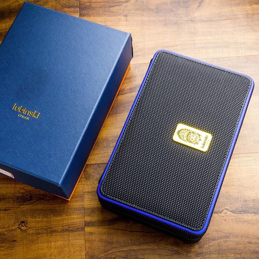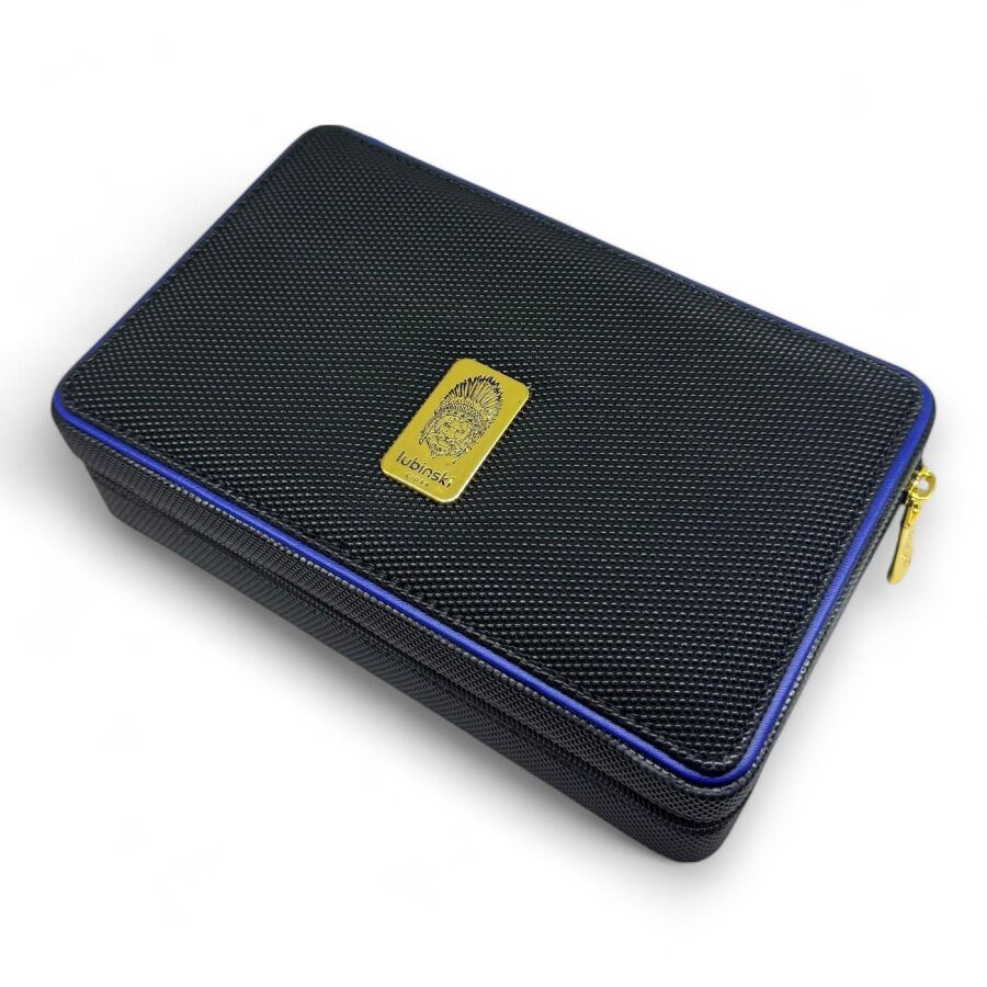 Puro kesici ve çakmak için özel taşıma cepleri bulunan humidor; onu çekici kılan kaplama dokusu, dikişleri ve mavi detaylara sahip.