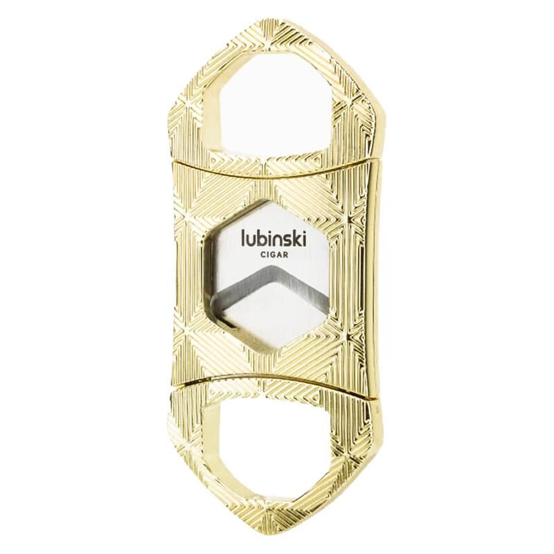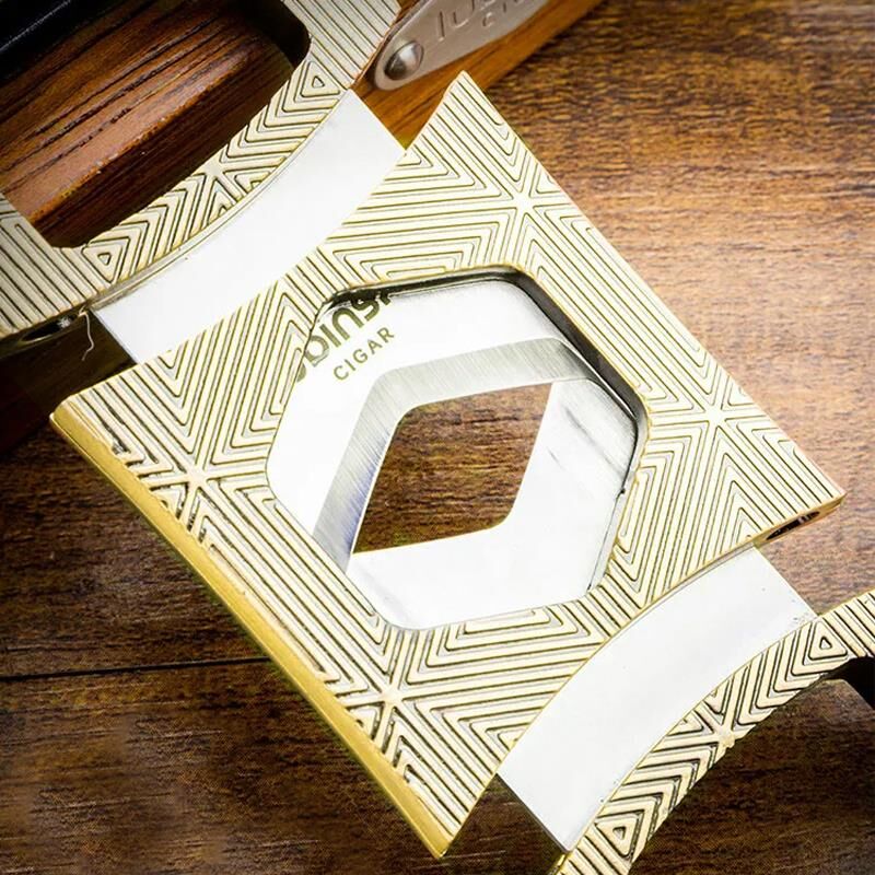 Paslanmaz çift bıçaklı puro kesicisi, gövdesindeki geometrik desenleri ile modern tasarıma sahiptir.