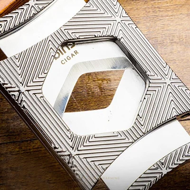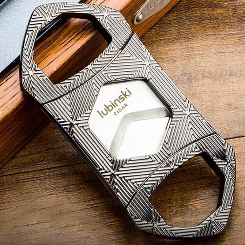 Paslanmaz çift bıçaklı puro kesicisi, gövdesindeki geometrik desenleri ile modern tasarıma sahiptir.