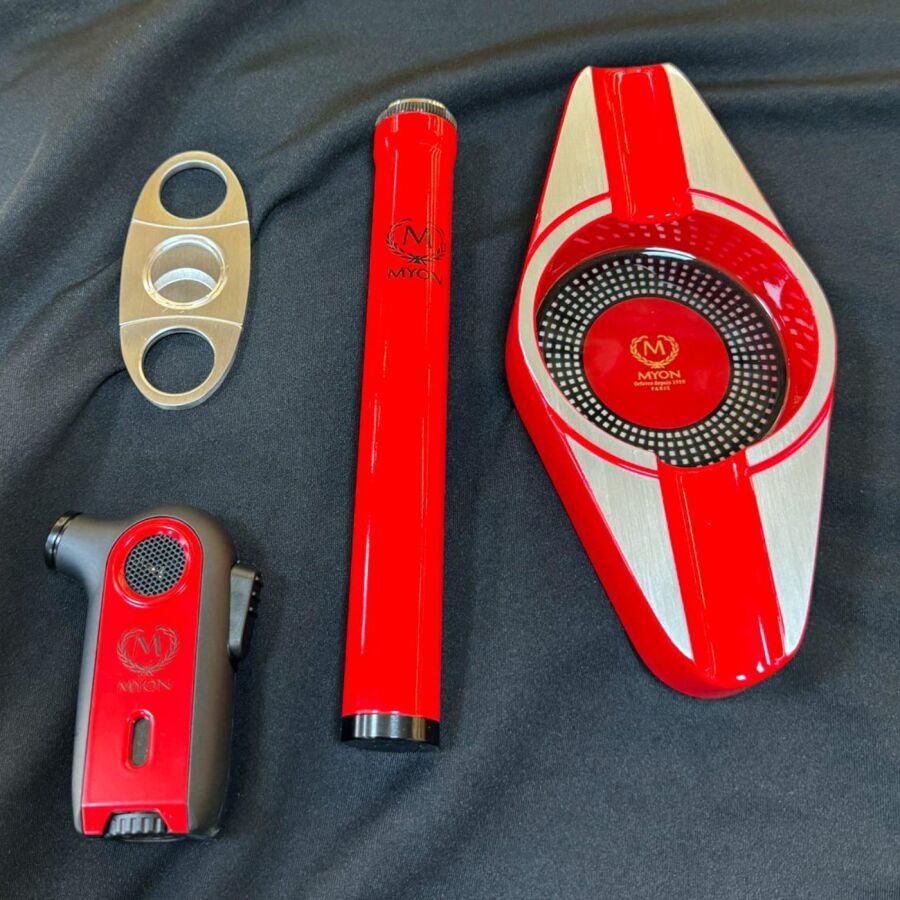 Myon Paris Elegance Puro Aksesuar Seti; metal puro kılıfı, aluminyum puro küllüğü, 1 pürmüz alev puro çakmağı ve kesiciden oluşmaktadır.