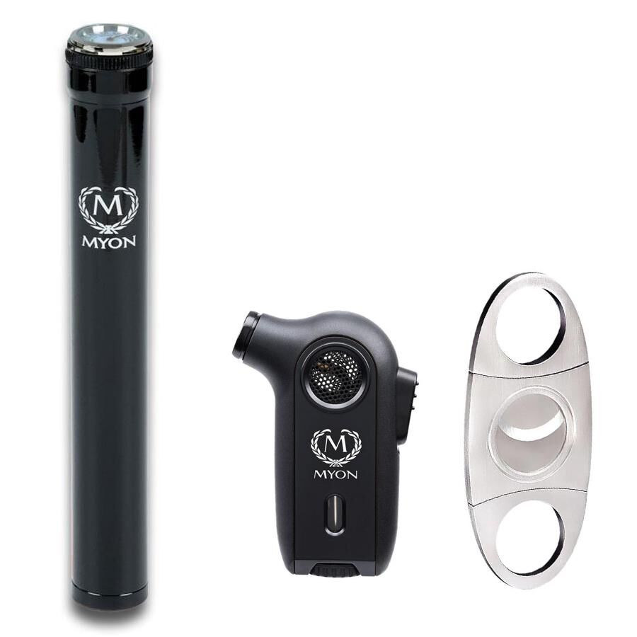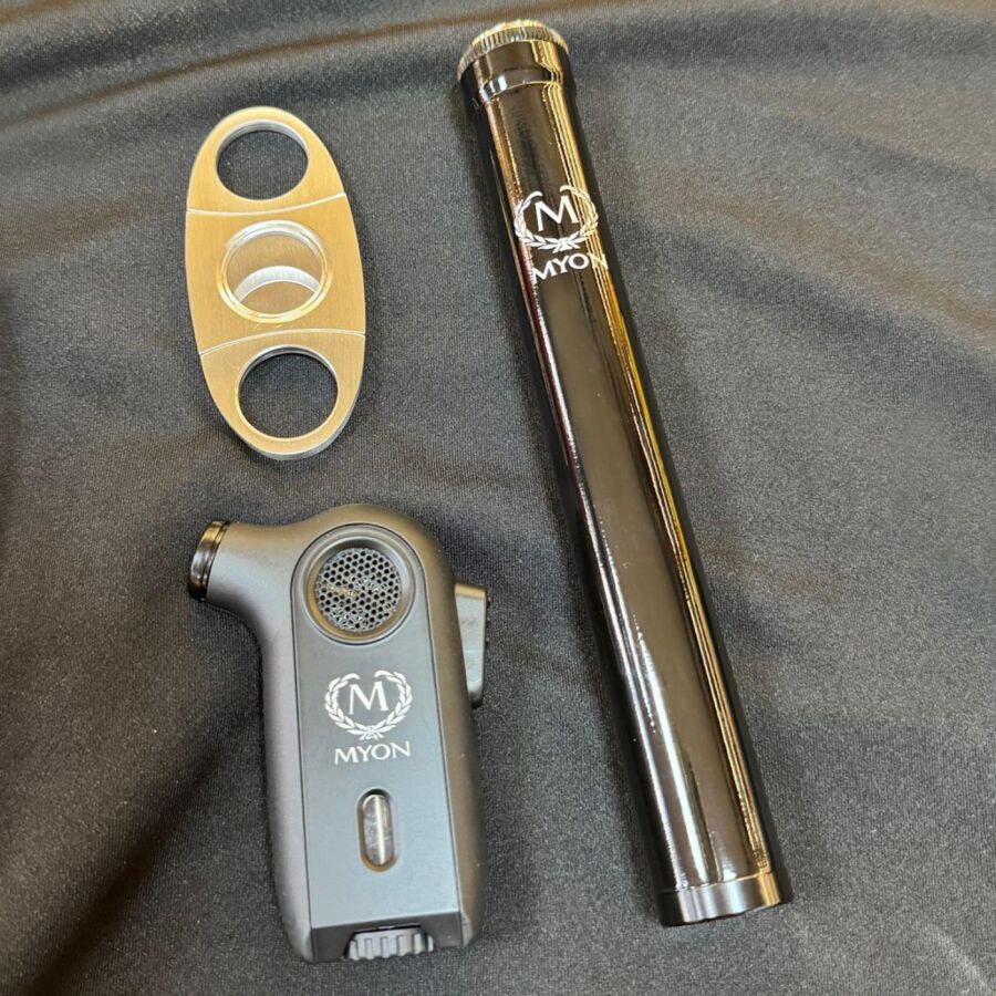 Myon Paris Royale Puro Aksesuar Seti; metal puro kılıfı, 1 pürmüz alev puro çakmağı ve kesiciden oluşmaktadır.