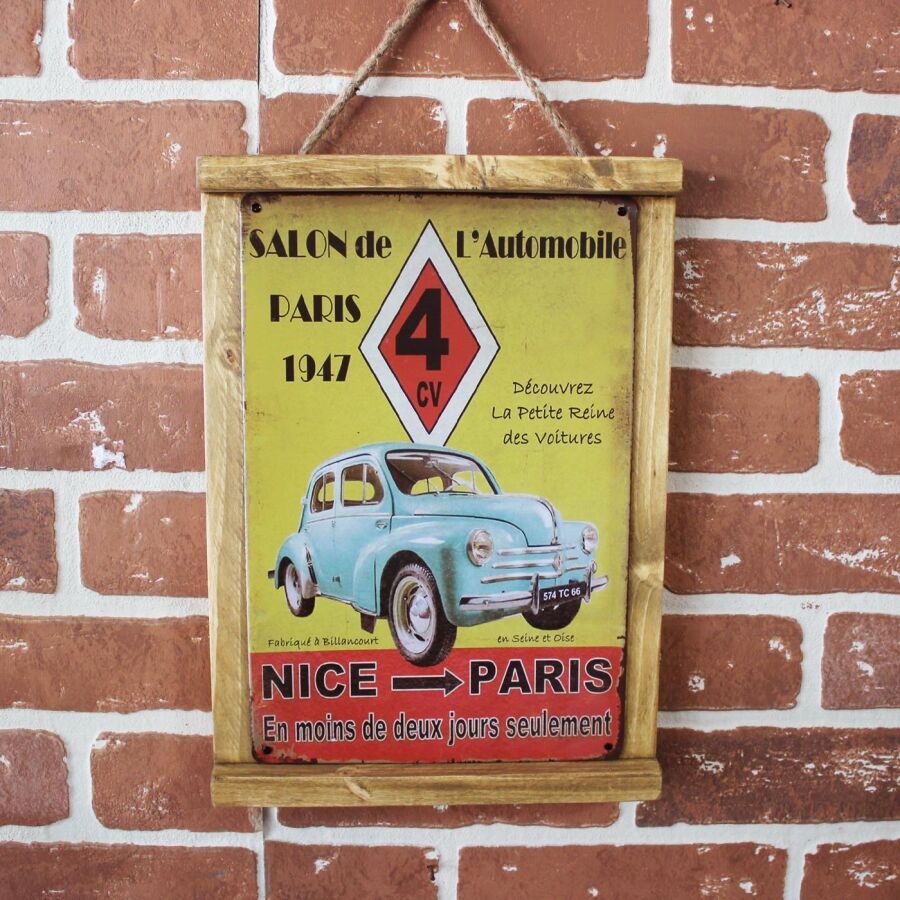 Rustik Ahşap Çerçeveli Vintage Metal Pano Nice Paris 20x30